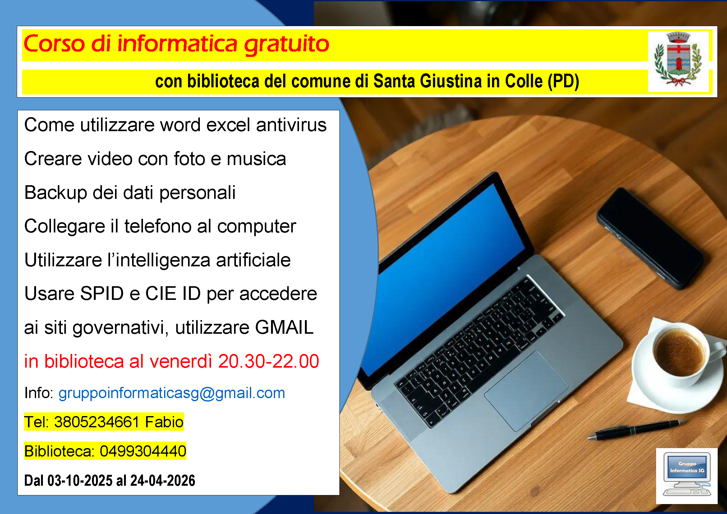 Il Gruppo Informatica SG in collaborazione con la Biblioteca Comunale di Santa Giustina in Colle organizza un 𝗖𝗢𝗥𝗦𝗢 𝗗𝗜 𝗜𝗡𝗙𝗢𝗥𝗠𝗔𝗧𝗜𝗖𝗔 𝗚𝗥𝗔𝗧𝗨𝗜𝗧𝗢