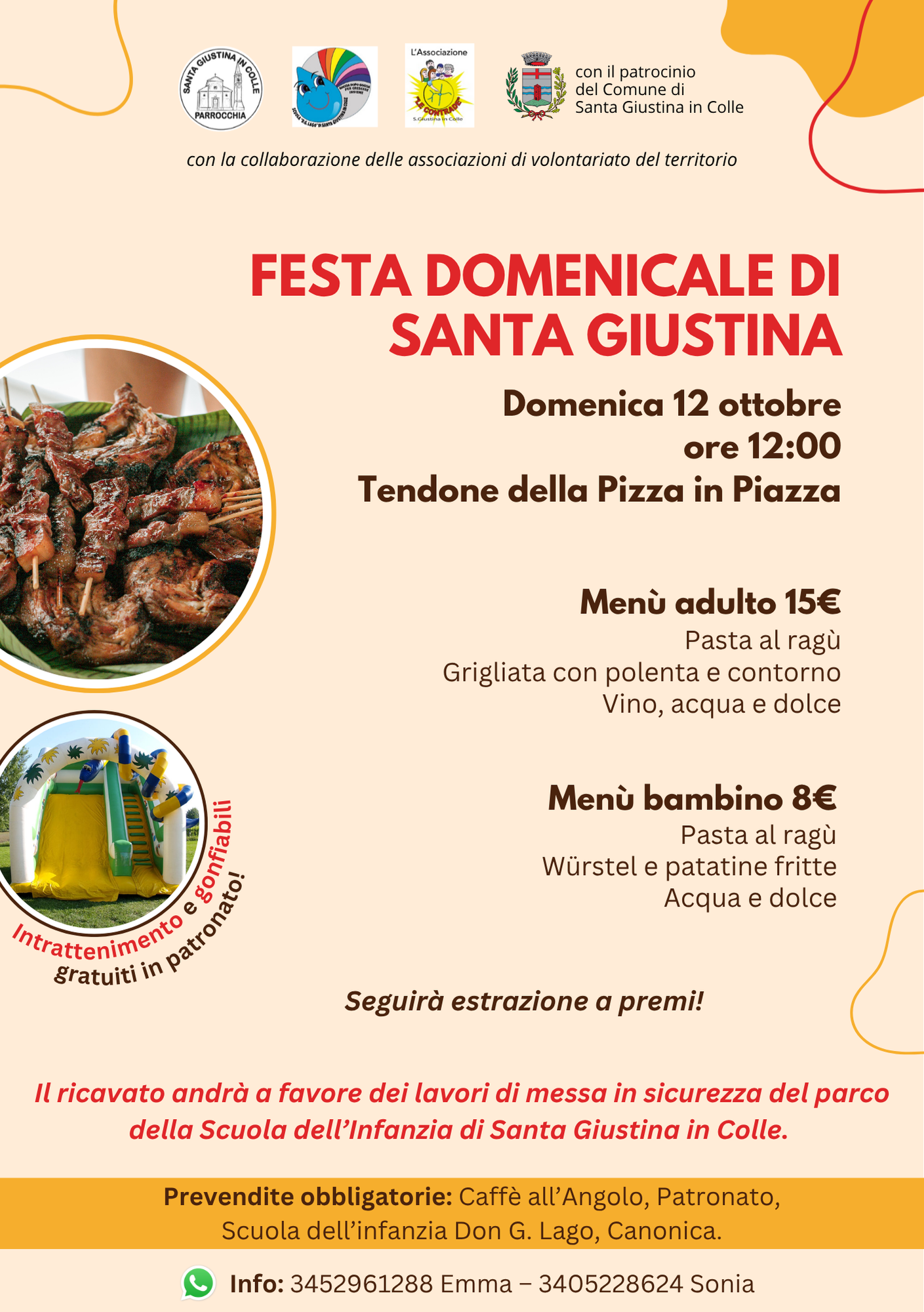 La Parrocchia di Santa Giustina in Colle e i suoi volontari, con il patrocinio del Comune di Santa Giustina in Colle, organizzano la Festa domenicale di Santa Giustina, per celebrare la Santa Patrona e le molte ricorrenze della comunità!